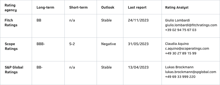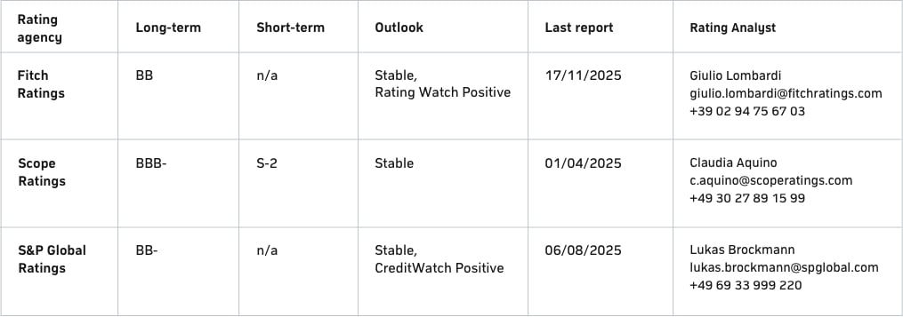 CECONOMY AG adheres to the principle of a prudent financial policy and is continuously evaluated by three rating agencies, Fitch, Scope and S&P. Ratings evaluate the ability of a company to meet its financial obligations. They communicate the creditworthiness of a company to potential debt capital investors and enable it to obtain attractive financing conditions on international capital markets.